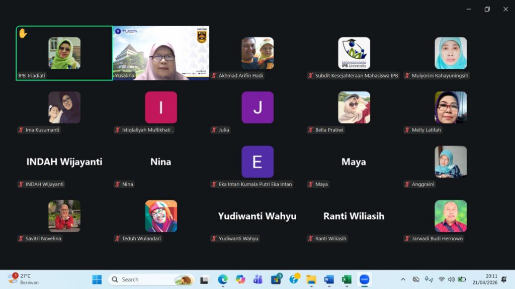 Bogor, 21/04/26 | Tim Bimbingan Konseling (TBK) IPB menggelar rapat koordinasi secara daring yang diikuti oleh Konselor Senior guna memperkuat peran pendampingan mahasiswa. Kegiatan ini dibuka oleh Asisten Direktur Kesejahteraan Mahasiswa, Dr. Yusalina, M.Si., yang menekankan pentingnya sinergi dalam menciptakan lingkungan kampus yang aman dan mendukung perkembangan mental mahasiswa.
