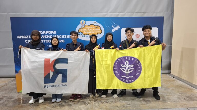 Bogor, 11/04/26 | Tim robot IPB University yang tergabung dalam tim Agrisena Aerial berhasil meraih peringkat ketiga dalam ajang internasional Singapore Amazing Flying Machine Competition (SAFMC). Awarding SAFMC diselenggarakan di Singapore EXPO, Hall 2B, pada 11 April 2026, sebagai puncak dari rangkaian kompetisi yang dilaksanakan selama tiga hari pada 30 Maret s.d. 1 April 2026.